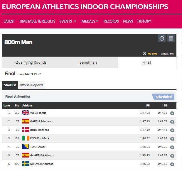 Amel Tuka u finalu EP šesti sa 1.47.91 – Najbolji bosanskohercegovački atletičar Amel Tuka večeras je osvojio 6. mjesto u finalnoj utrci na 800 metara na Evropskom dvoranskom prvenstvu u Glasgowu istrčavši finalnu trku 1.47.91
