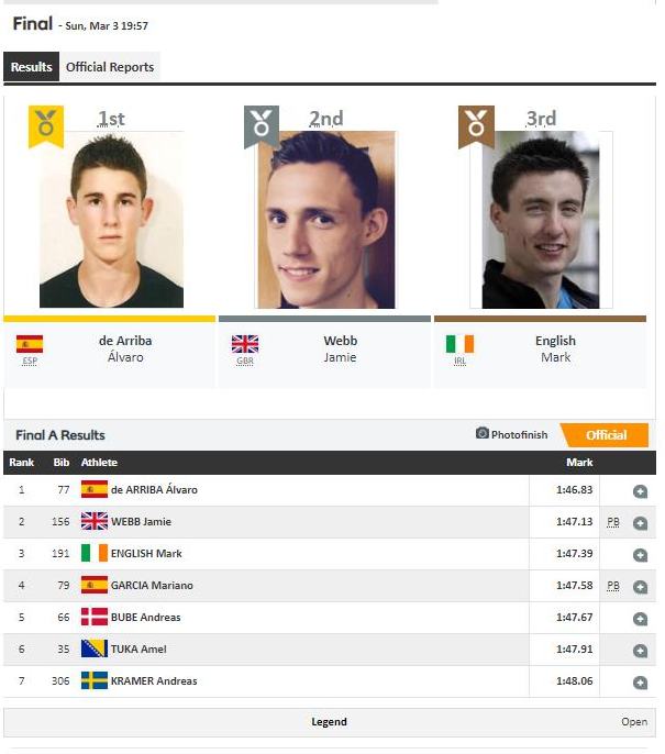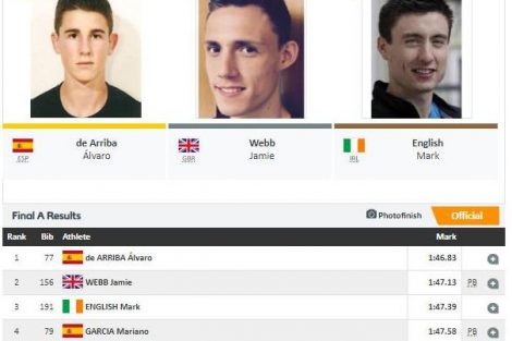 Evropsko zlato osvojio je de Arriba (1:46.83), srebro Webb (1:47.13), a bronzu English (1:47.39).