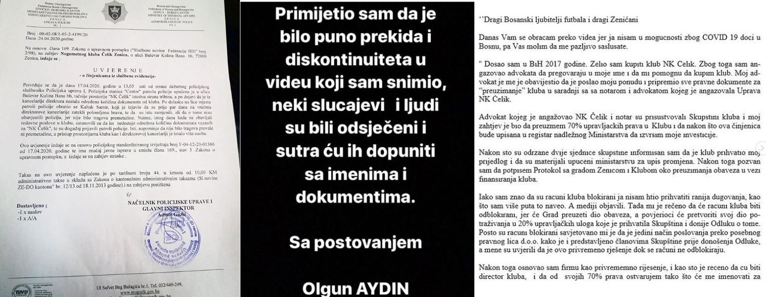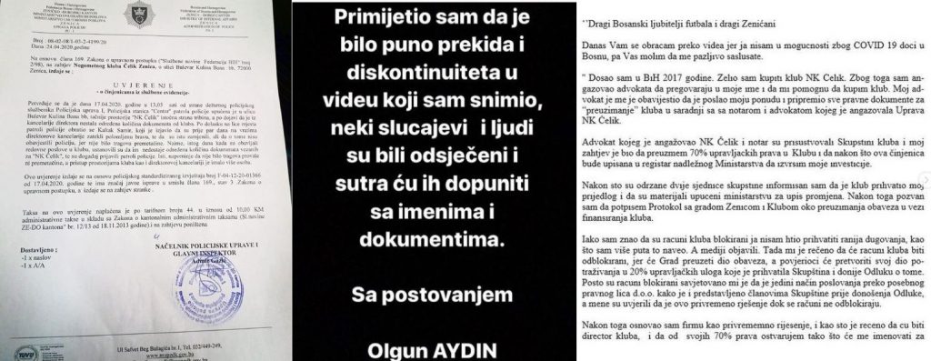 “Klub ćemo vratiti onako kako smo ga i uzeli”, istakao je Olgun, koji je detaljno obrazložio razloge napuštanja Čelika i Zenice. Napomenuo kako je nailazio na mnoge prepreke u radu te da su u klubu, bez njegove saglasnosti, sačinjavali štetne ugovore i zadužili ga, a o čemu je saznao tek kada su počeli prikupljati dokumentaciju za licenciranje kluba za takmičenje u Premijer ligi BiH.