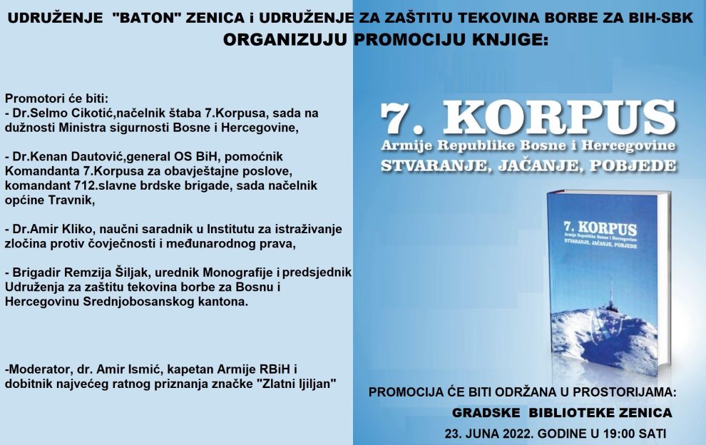Udruženje “Baton ” Zenica u saradnji sa Udruženjem za zaštitu tekovina borbe za Bosnu i Hercegovinu/Srednjobosanskog kantona u petak 23. juna 2022. godine, u prepunoj sali Gradske biblioteke Zenica, organizovali su promociju knjige pod nazivom: Sedmi korpus Armije Republike Bosne i Hercegovine ,stvaranje, jačanje, pobjede.