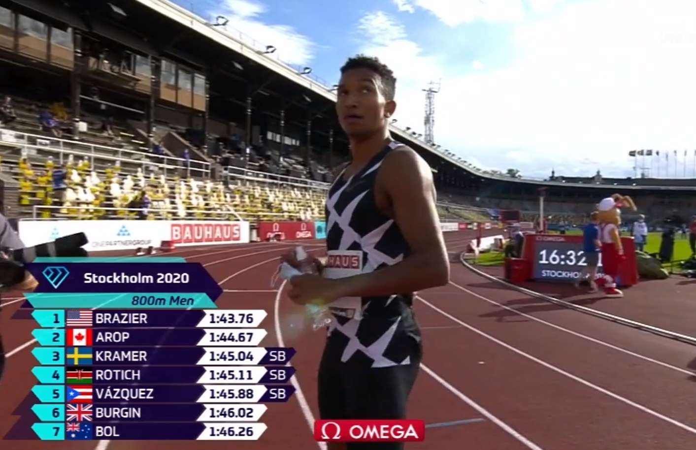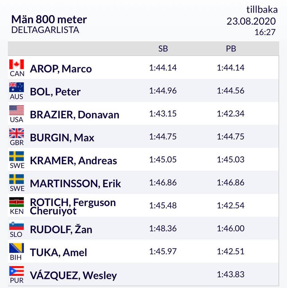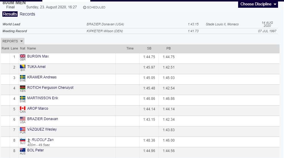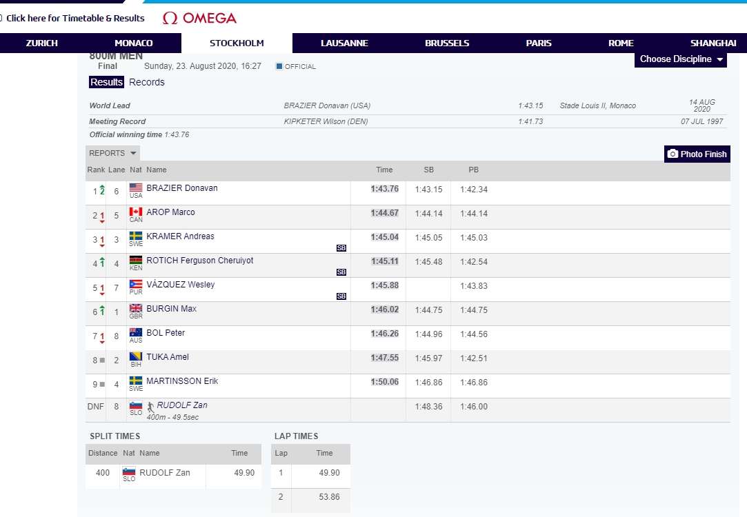 Prvi je bio Donovan Braizer (SAD) sa 1.43.76. Drugi je bio Kanađanin Marco Arop sa 1.44.67, a treći Andreas Kramer (1.45.04). Najbolje lične rezultate ove sezone postigla su trojica atletičara Rotich, Vasquez i Burgin.