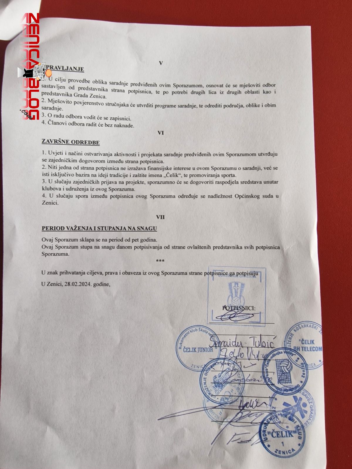 Potpisnici ovog sporazuma su: Nogometni klub Čelik, Omladinski košarkaški klub Čelik, Košarkaški ženski klub Čelik-BH Telecom, Rukometni klub škola rukometa Čelik Junior, Odbojkaški klub Čelik Volley Zenica, Odbojkaški klub Čelik-R i Ragbi klub Čelik.