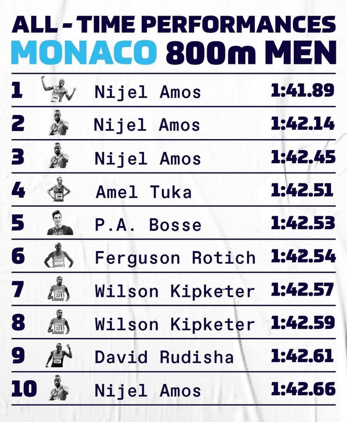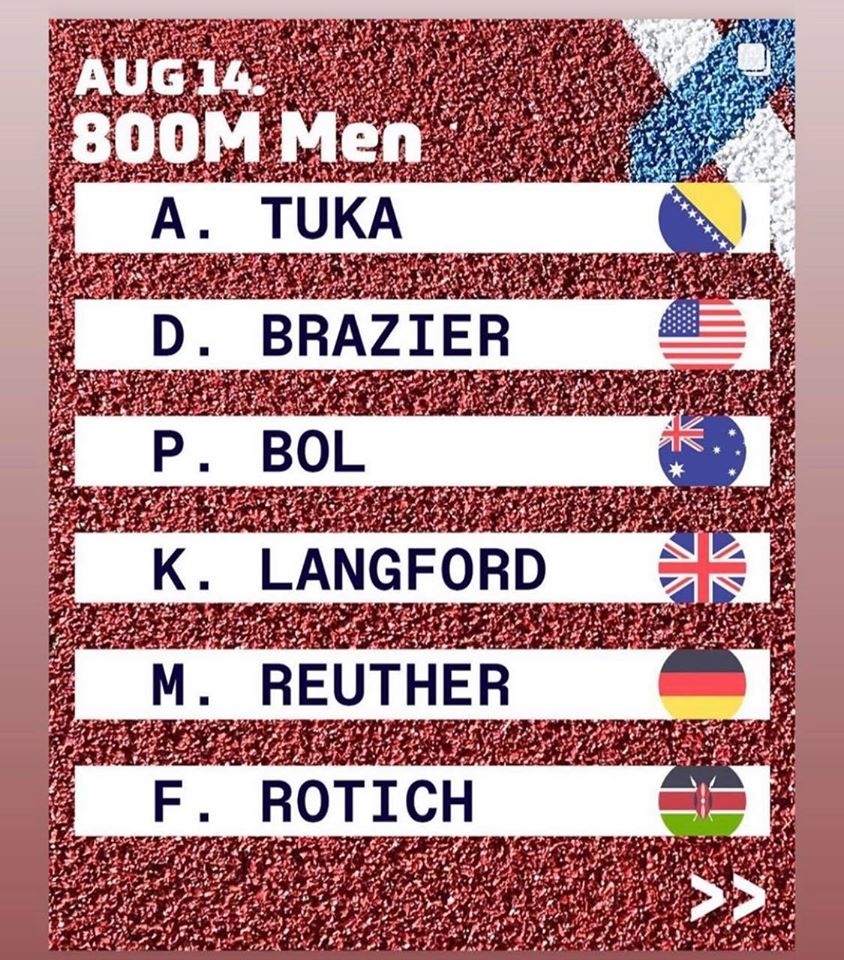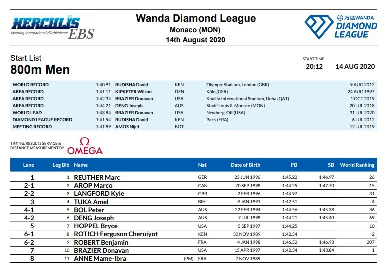 Najbolji bosanskohercegovački atletičar Amel Tuka večeras je nastupio na mitingu Dijamantske lige – Herkules mitingu u Monaku u utrci na 800 metara. Sa vremenom 1.45.97 završio je na devetom mjestu, mjesto iza Roticha. On i Rotich su imali najbolje lično vrijeme uoči trke, ali je ova trka ostala zapisana kao trka sa najviše najboljih ličnih rezultata.