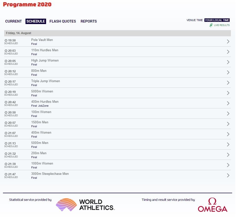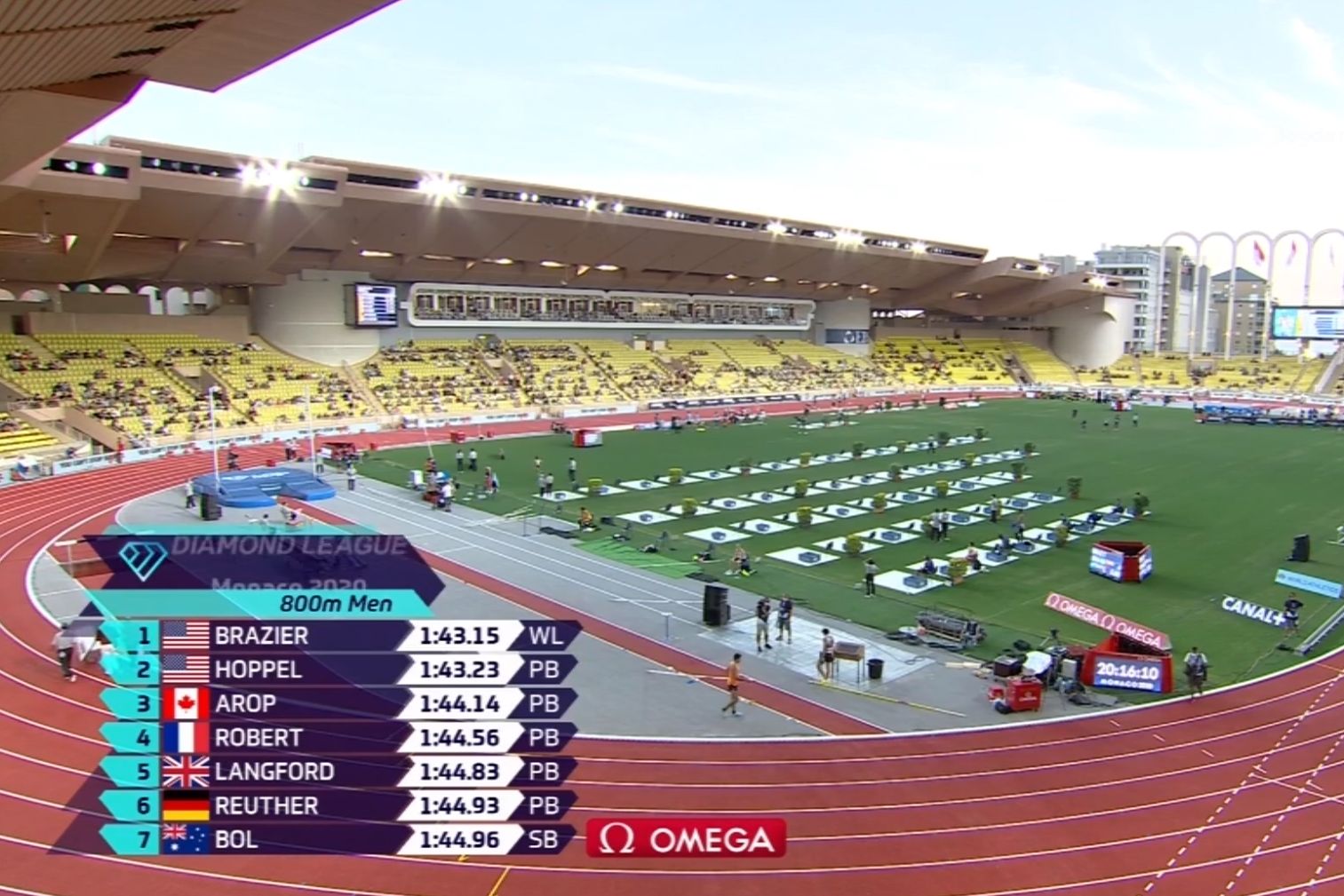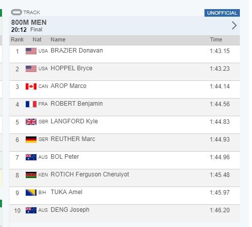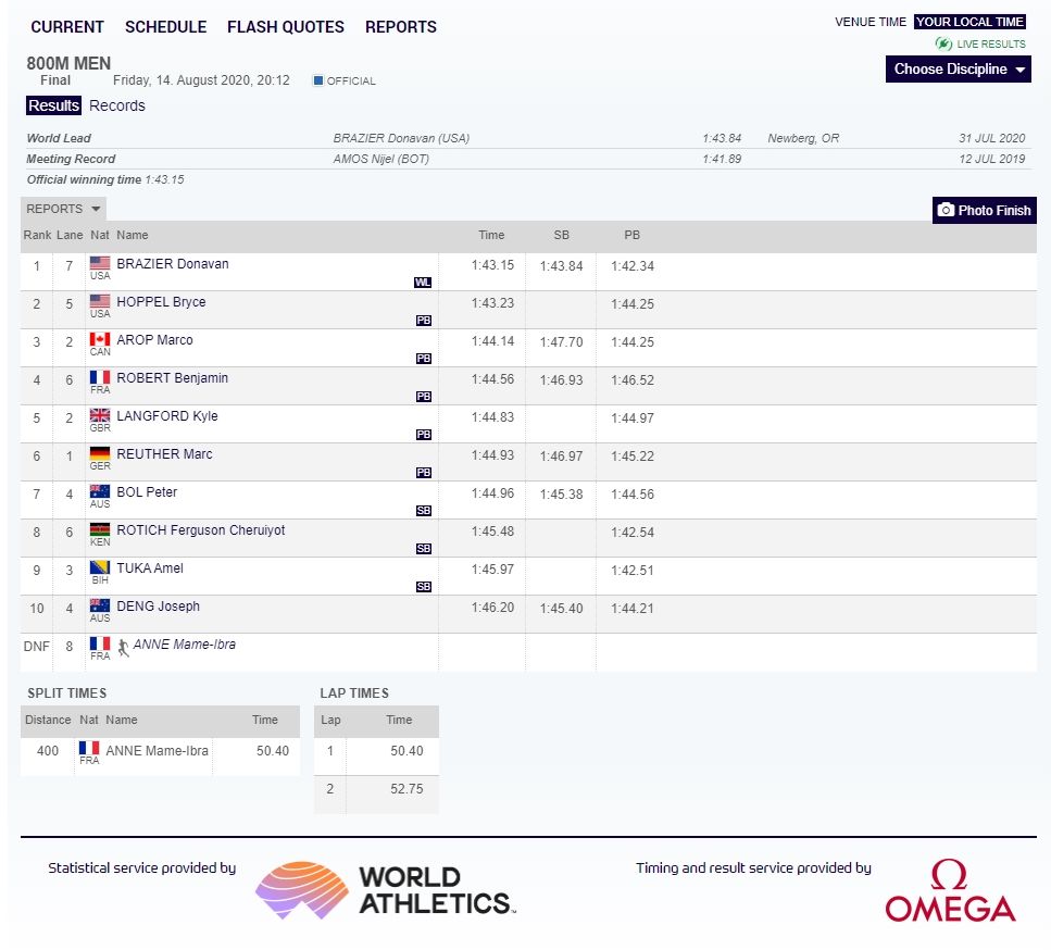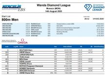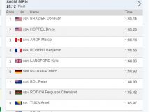 Prvo mjesto s najboljim rezultatom sezone (1:43.15) osvojio je svjetski prvak Amerikanac Donavan Brazier, ispred sunarodnjaka Brycea Hoppela (1:43.23) i Kanađanina Marca Aropa (1:44.14), koji su istrčali lične rekorde.