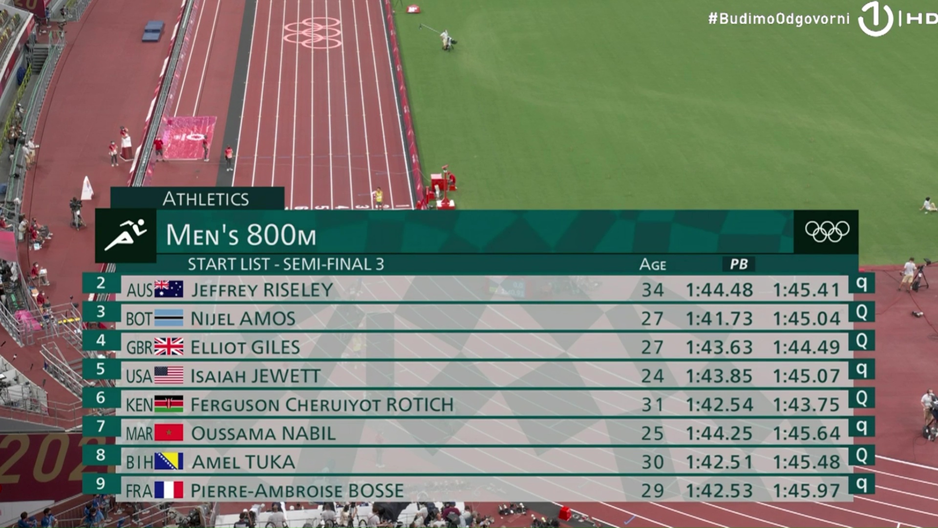 Finalna utrka na 800 metara na rasporedu je u srijedu s početkom u 14:05 sati kada će biti poznato ko će se okititi medaljama u Tokiju u ovoj atletskoj disciplini.