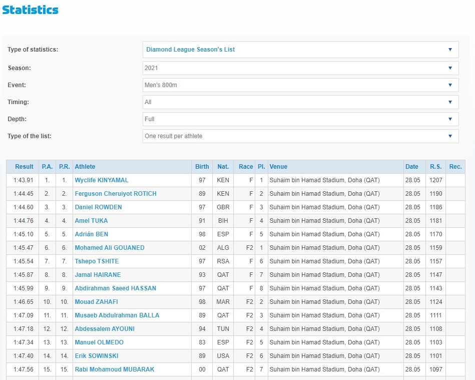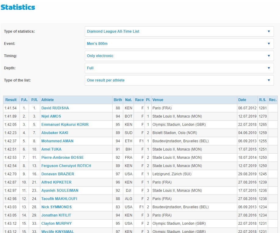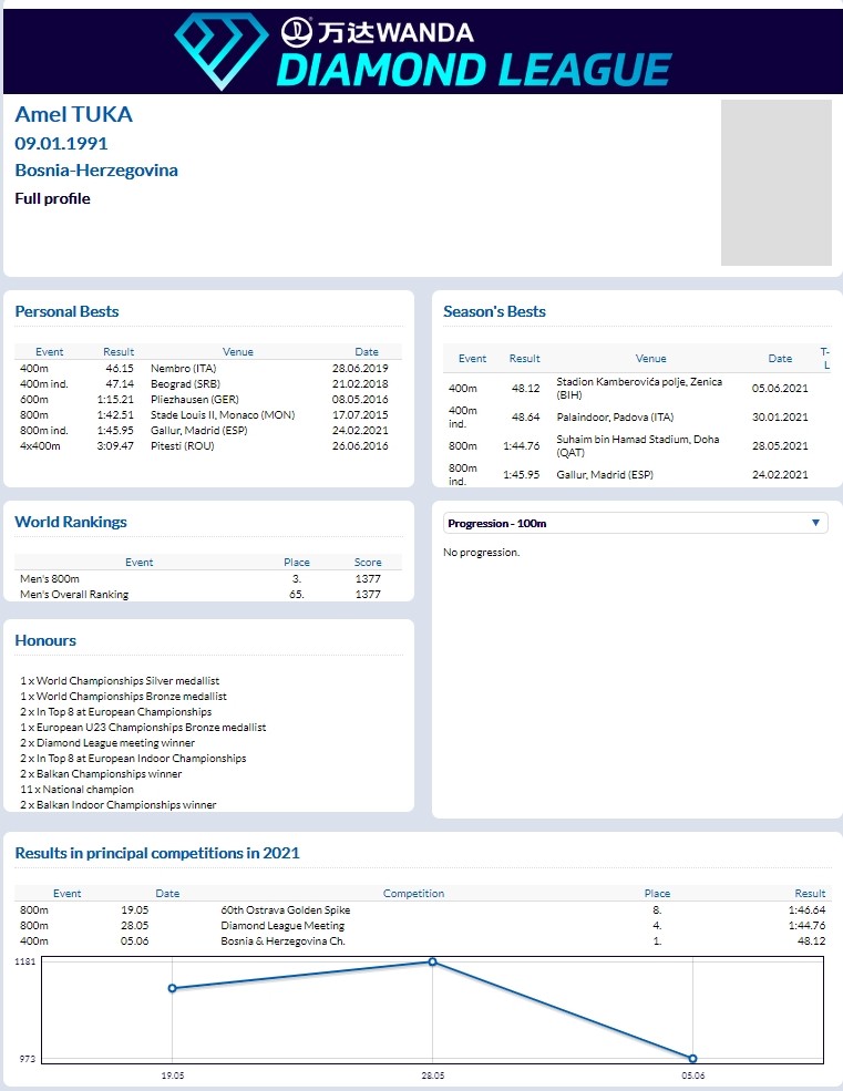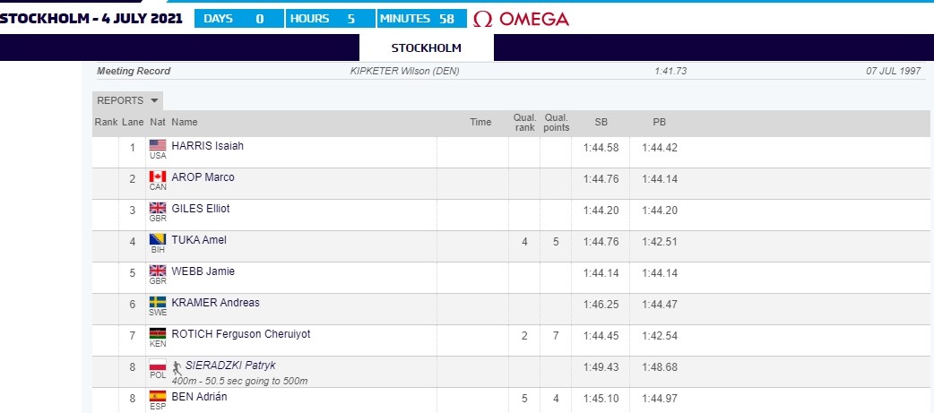 Današnja utrka na 800 metara u okviru Dijamantske lige održana je po rasporedu u 16:48 sati, a zanimljivo od devet prijavljenih takmičara Amel Tuka je imao najbolji lični rekord na toj udaljenosti. Naime, najbolji istrčani rezultat ovog Zeničanina je 1.42.51, a tri stotinke slabije od njega trčao je Kenijac Cheruiyot Ferguson Rotich (Rotič).