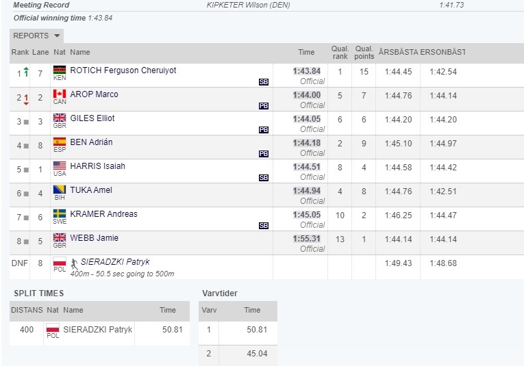 Ostali učesnici, Španac Adrian ben, Šveđanin Andreas Kramer, Britanci Jamie Webb i Elliot Giles, Kanađanin Marco Arop i Amerikanac Isiah Harris su svoja najbolja vremena smjestili unutar minut i 44 sekunde i nešto stotinki. Daleko najslabiji je Poljak Patryk Sieradzki (1.48.68), koji je bio “pacemaker” trke do 500-tog metra.