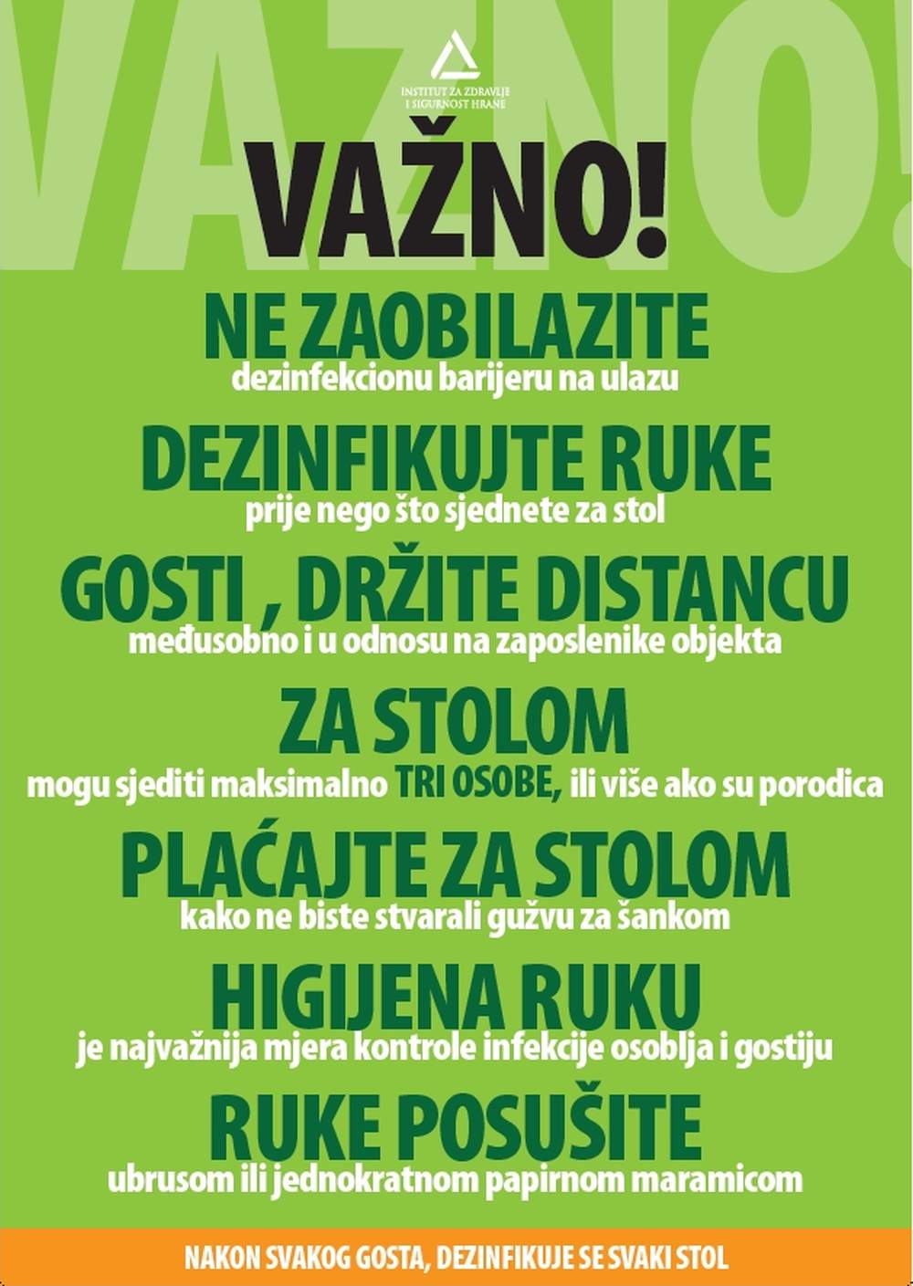 Institut za zdravlje i sigurnost hrane Zenica nastavio je podržavati sve segmente društva, kroz izradu edukativnih plakata, letaka i brošura na aktuelnu temu. Ovaj put, producirani su plakat, brošura i kratki video, koji trebaju biti na usluzi i korištenje kako vlasnicima i osoblju, tako i gostima ugostiteljskih objekata u Bosni i Hercegovini, u vrijeme aktivnih mjera zaštite od novog koronavirusa.