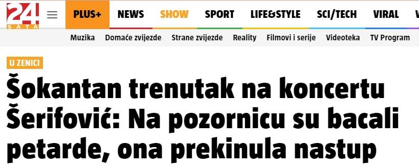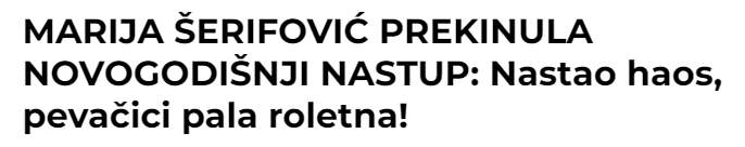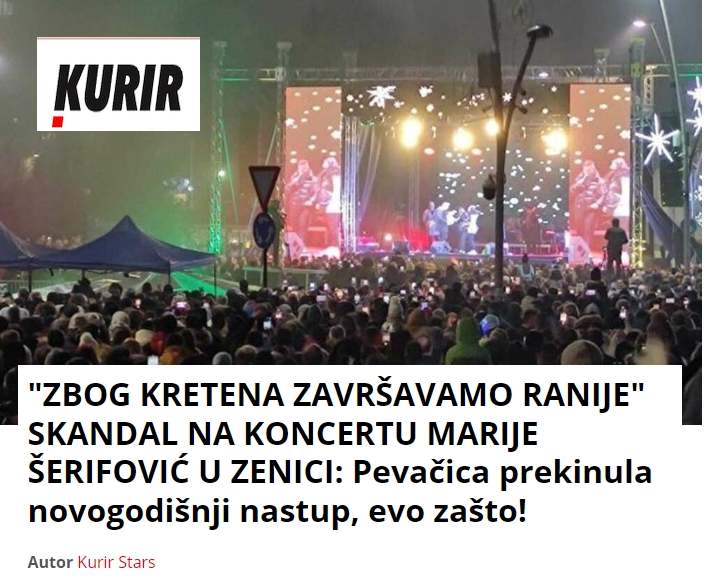 Šokantan trenutak na nastupu, Marija Šerifović jedva izvukla živu glavu, kaos na nastupu.. samo su neki od naslova koji su jutros osvanuli na portalia u Hrvatskoj i Srbiji nakon što je nastup Merije Šerifović u Zenici na dočeku Nove godine završen “15 minuta ranije”, kako je ona rekla.