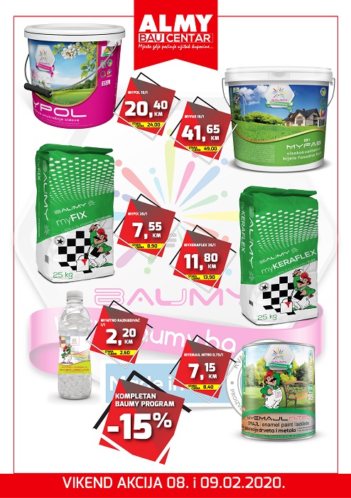 Vikend akcija u Bau centrima kompanije Almy – “Vikend akcija u Bau centrima kompanije Almy u Zenici, Zavidovićima i Nemili. Kompletan Baumy program snižen 15%. Akcija traje 08. i 09.02.2020. i važi samo za gotovinsko plaćanje. Trideset godina sa Vama, kompanija Almy!”