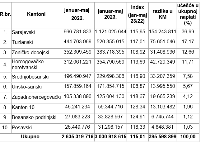 U odnosu isti period 2022. godine, to je više za 395,5 miliona maraka, ili 15,01 posto, a u odnosu na januar – maj 2019. godine više za 831,8 miliona maraka ili 37,83 posto, saopćeno je iz Porezne uprave FBiH.