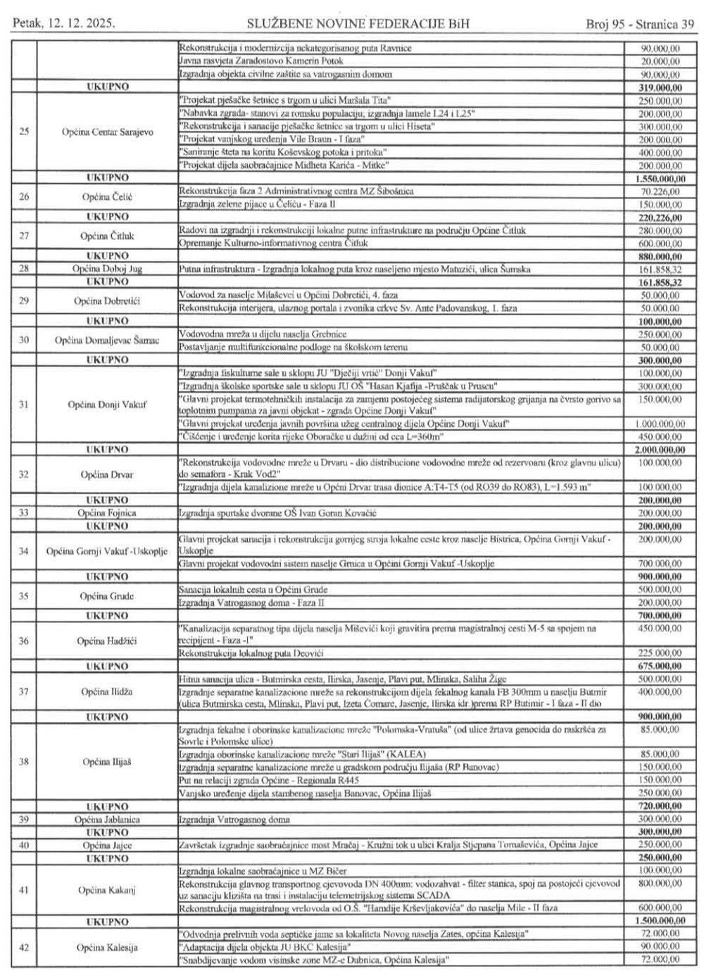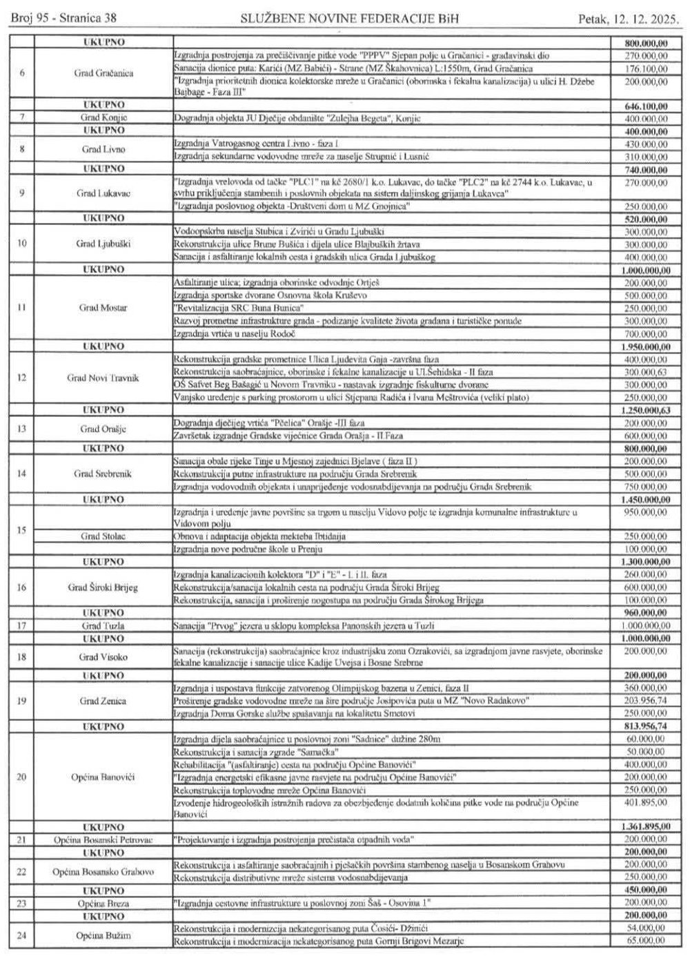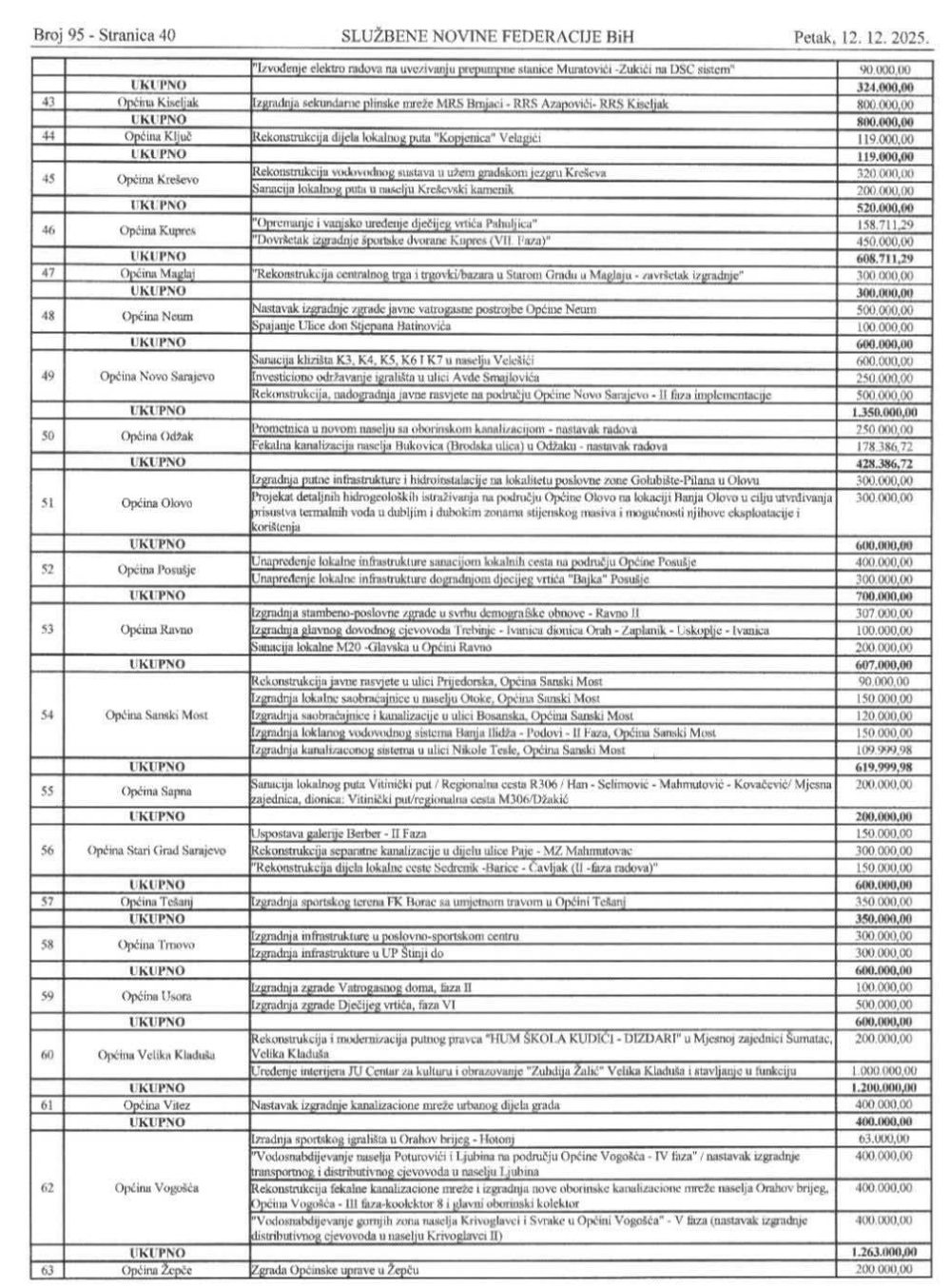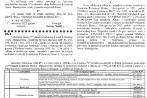Odluka Vlade FBIH sa svim gradovima/općinama i iznosima u nastavku