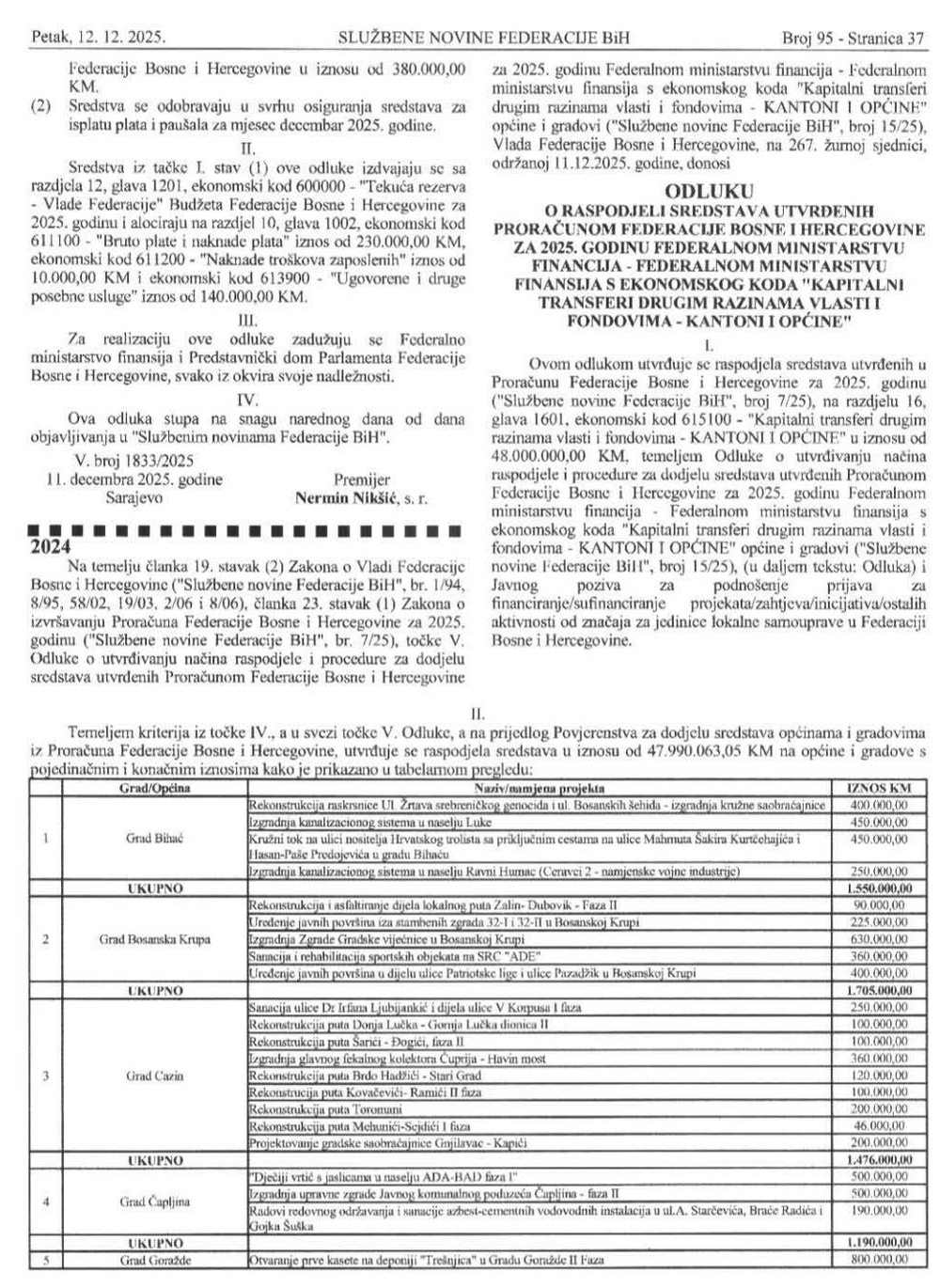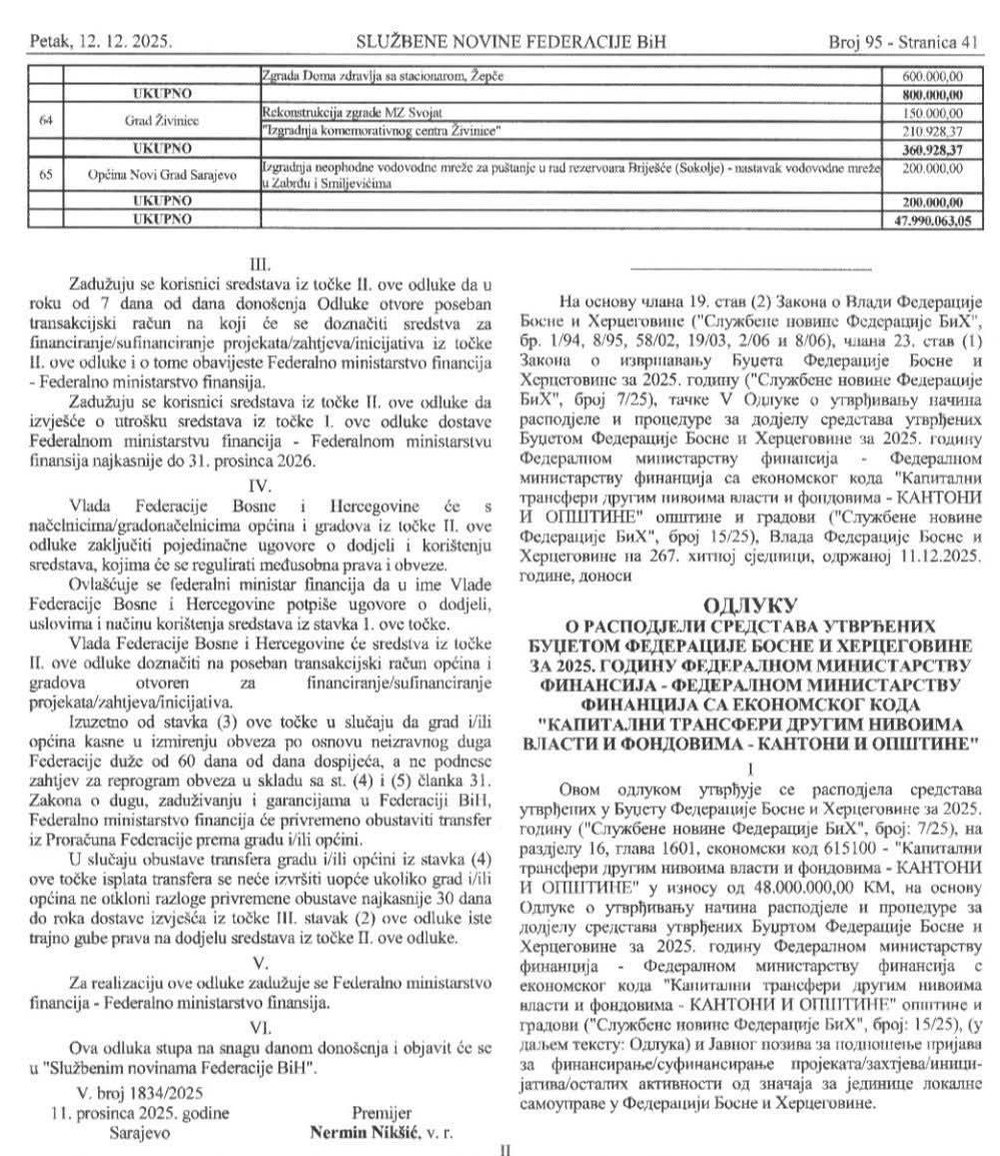 Federalni dopremijer također je potvrdio da je Vlada FBiH usvojila i Odluku o raspodjeli sredstava jedinicama lokalne samouprave, koje spadaju u V. kategoriju razvijenosti, utvrđenih Budžetom Federacije Bosne i Hercegovine za 2025. godinu Federalnom ministarstvu financija sa ekonomskog koda „Tekući transferi drugim razinama vlasti i fondovima – kantoni i općine“ kojom su raspoređena 2.000.000 KM.