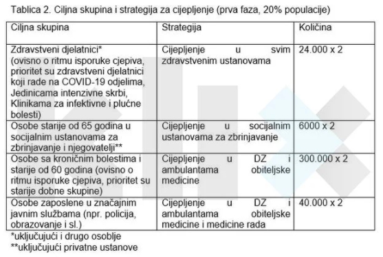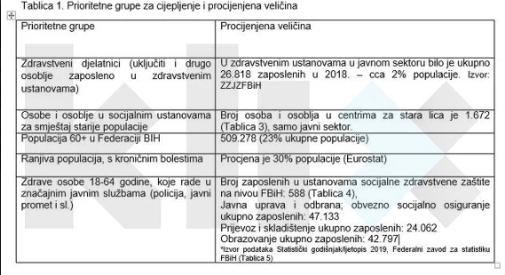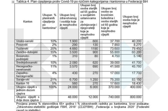 U tabeli se navodi i tačan broj zdravstvenih radnika koje je potrebno imunizirati po kantonima, kao i broj osoba starijih od 65 godina u socijalnim ustanovama te hroničnih bolesnika i starijih od 60 koje je potrebno vakcinisati.