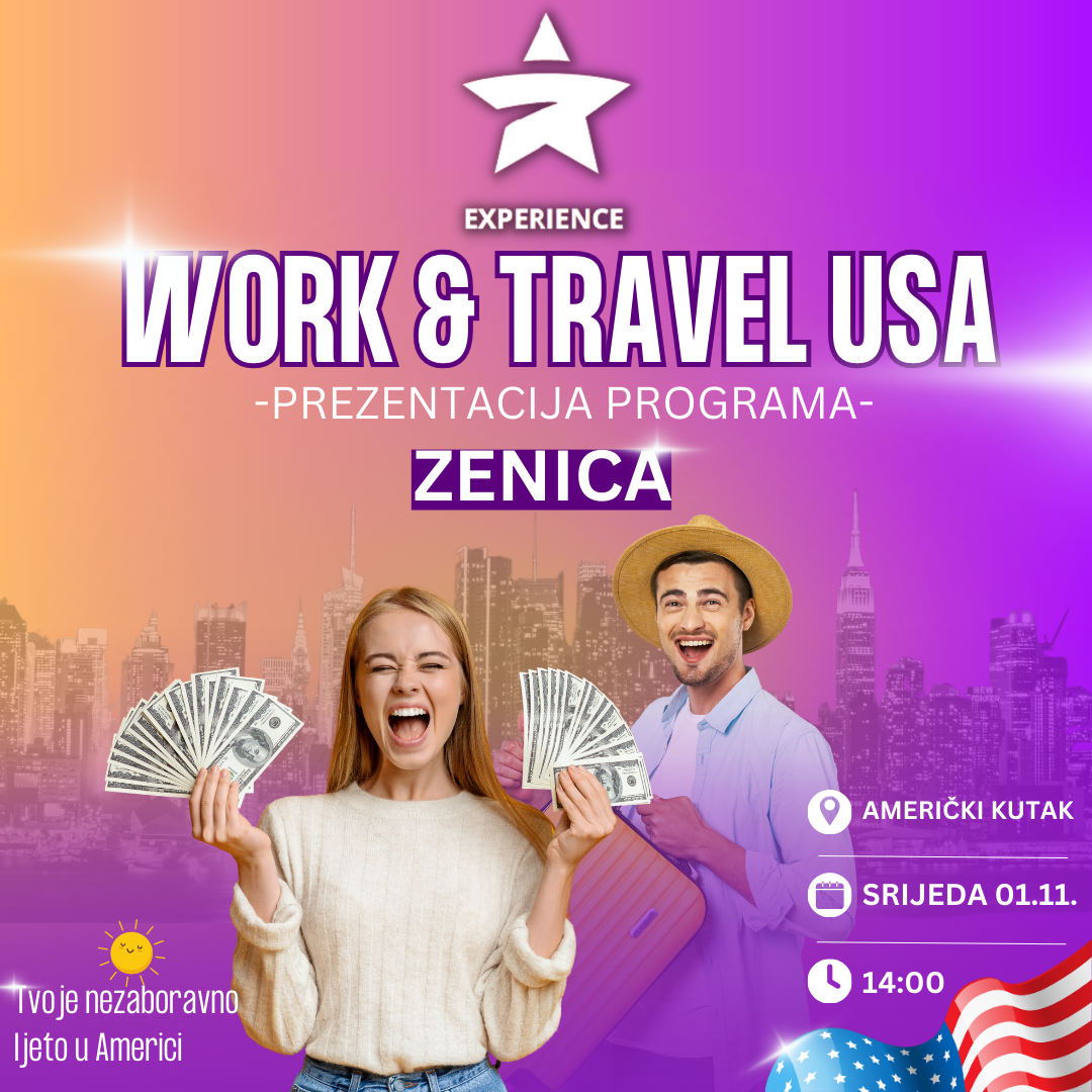 Želite li iskusiti nezaboravno ljeto u Americi, putovati, raditi i zaraditi, te usavršiti svoje znanje engleskog jezika do naprednog nivoa, dok istovremeno uživate u druženju, putovanjima i stvaranju trajnih prijateljstava s mladima iz cijelog svijeta? Ako je vaš odgovor da, pridružite nam se na prezentaciji Work and Travel USA programa!