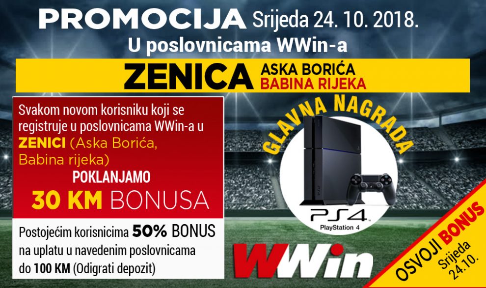WWin promocija: Bonus od 30 KM za sve koji se sutra registruju u u poslovnicama Wwin-a u Zenici (Aska Borića, Babina rijeka) – WWin promocija: Bonus od 30 KM za sve koji se sutra registruju u u poslovnicama Wwin-a u Zenici (Aska Borića, Babina rijeka). Jednom korisniku poklanjamo PS4.