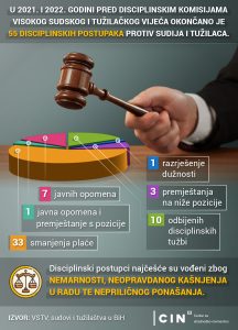 Visoko sudsko i tužilačko vijeće Bosne i Hercegovine (VSTVBiH) je u 2021. i 2022. godini okončalo disciplinske postupke protiv 55 sudija i tužilaca po tužbama Ureda disciplinskog tužioca (UDT) zbog kršenja Zakona o VSTV-u i etičkih kodeksa.