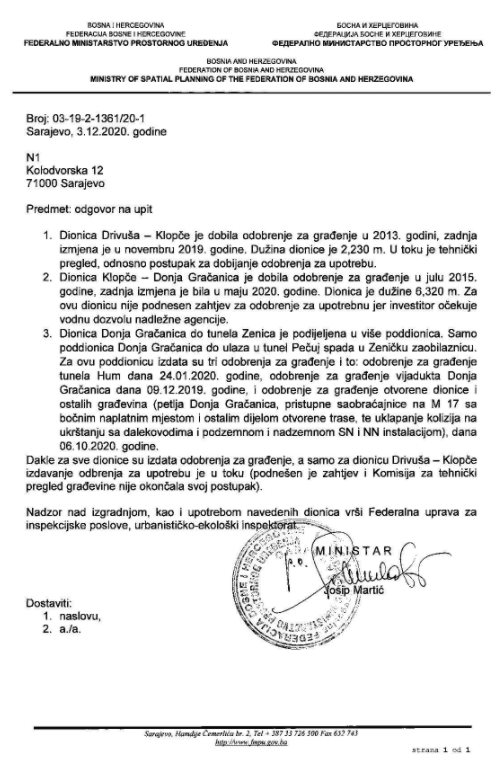 No u Ministarstvu prostornog uređenja koje je nadležno za dozvole, odbijaju ove navode. Upotrebna dozvola nije izdata, niti je u resorno Ministarstvo stigao zahtjev za upotrebnu dozvolu za dvije poddionice, odnosno tehnički prijem ceste.