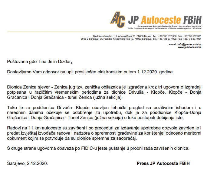 Ostali smo uskraćeni i za odgovor kako su u JP Autoceste FBiH uvjereni u pozitivan ishod izvještaja Komisije za tehnički prijem za prvu poddionicu, kada izvještaj nije stigao u Ministarstvo prostornog uređenja.