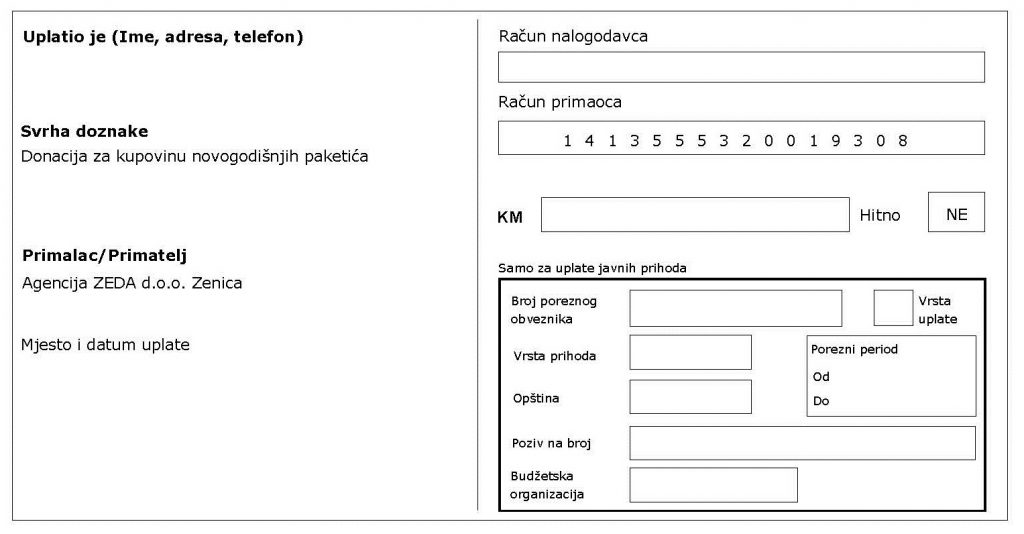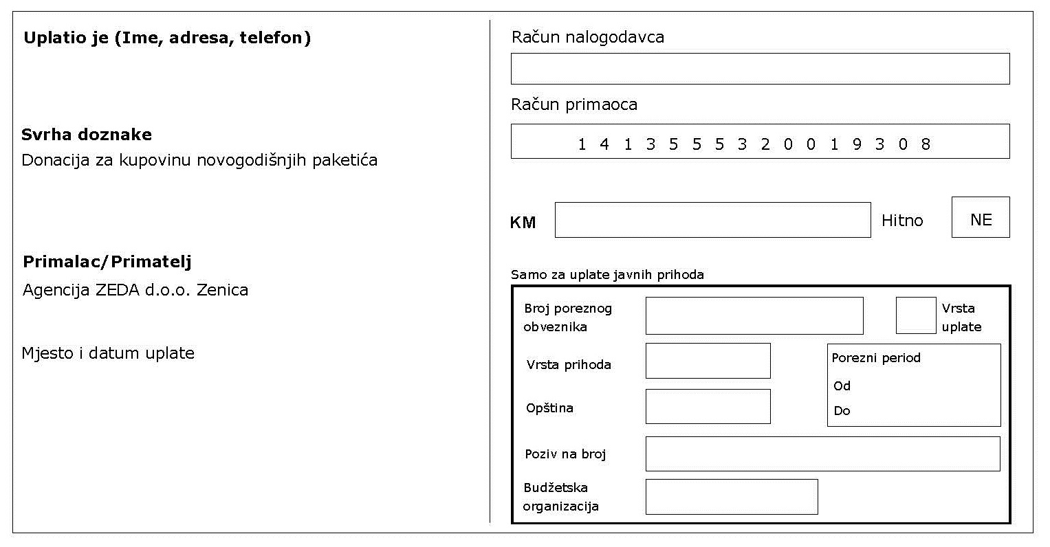 Ukoliko želite dati svoj doprinos, molimo Vas da uplatu izvršite najkasnije do 20.decembra 2019. godine.