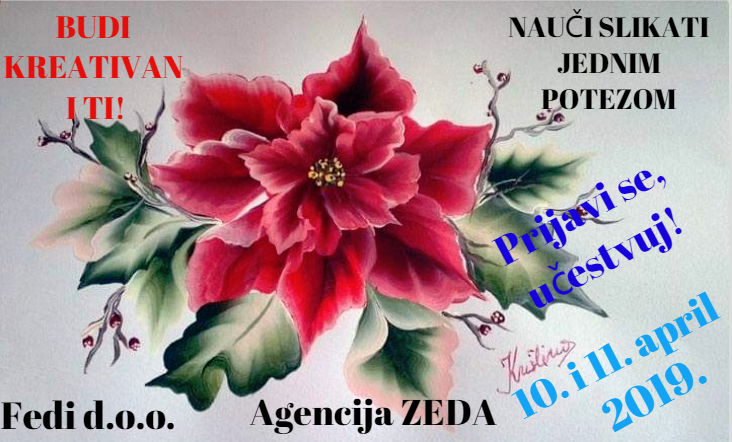 ZEDA vas poziva na radionicu: “Budi kreativan i ti” – nauči slikati jednim potezom! – Agencija ZEDA u saradnji s preduzećem Fedi d.o.o. Zenica, objavljuje poziv za učešće na četvrtoj kreativnoj radionici u mjesecu aprilu. Radio se o radionici slikanja jednim potezom (OSP-one stroke ponited).