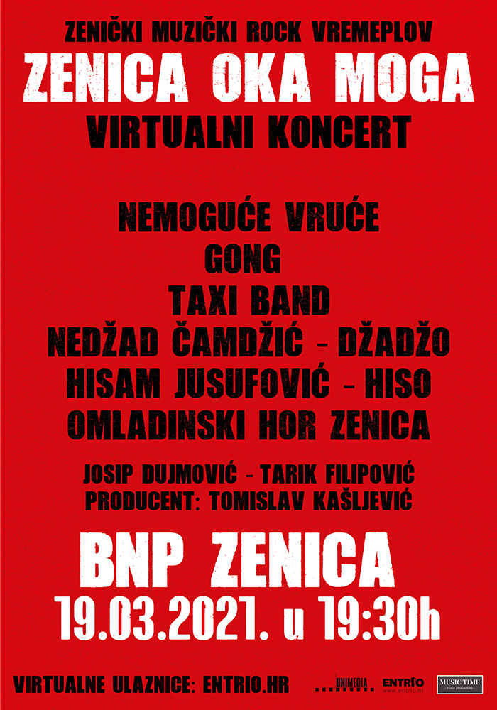 „Zenica oka moga“ – prvi virtuelni koncert koji spaja rock generacije- Prvi virtuelni koncert posvećen zeničkoj muzičkoj rock sceni bit će održan u petak, 19. marta sa početkom u 19.30 sati. Naime, radi se o projektu koji u vrijeme pandemije svojevrsnim vremeplovom, online putem, pruža muzičku čaroliju koja dolazi u vlastite domove, a koji je namijenjen gledateljima širom svijeta. Koncertni spektakl će biti izveden na Velikoj sceni Bosanskog narodnog pozorišta Zenica, a publika će imati priliku da virtuelno uživa u svojim domovima u izvedbi romantične muzike šezdesetih, dinamične muzike šezdesetih i muzike zlatnih osamdesetih.