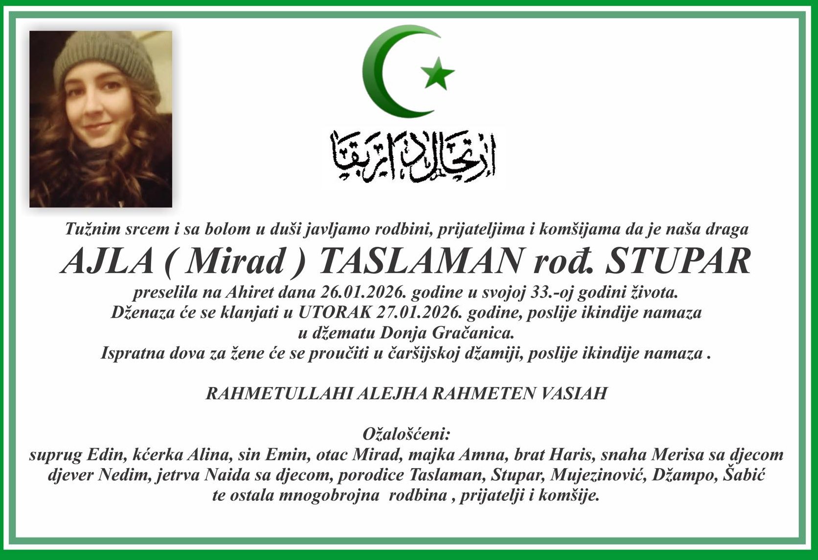 Ajla Taslaman smrtovnica, Ajla Stupar Donja Gračanica, dženaza Donja Gračanica, umrla Ajla Taslaman, preselila na Ahiret Zenica, smrtovnice BiH, osmrtnice januar 2026, dženaza 27.01.2026