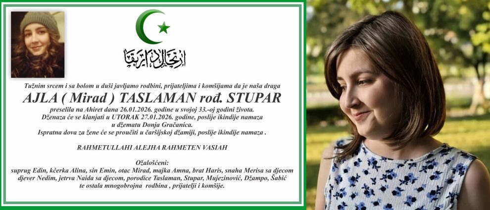 Ajla (Mirad) Taslaman, rođena Stupar, preselila na Ahiret jučer 26. januara 2026. godine, u 33. godini života.