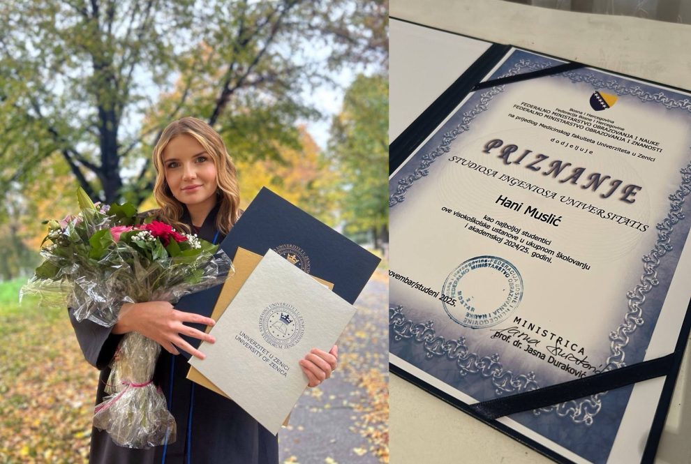 Zeničanka Hana Muslić dobitnica je Priznanja Federalnog ministarstva obrazovanja za najboljeg studenta, čime je još jednom potvrđen njen izuzetan akademski uspjeh i kontinuirani rezultati tokom obrazovanja.