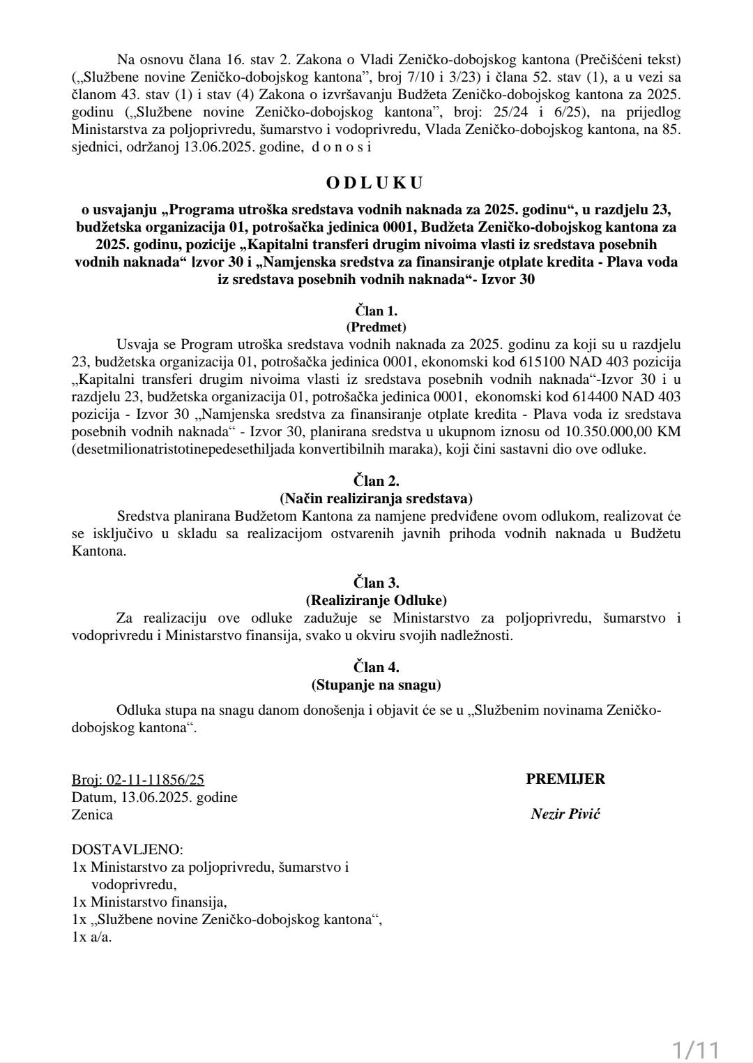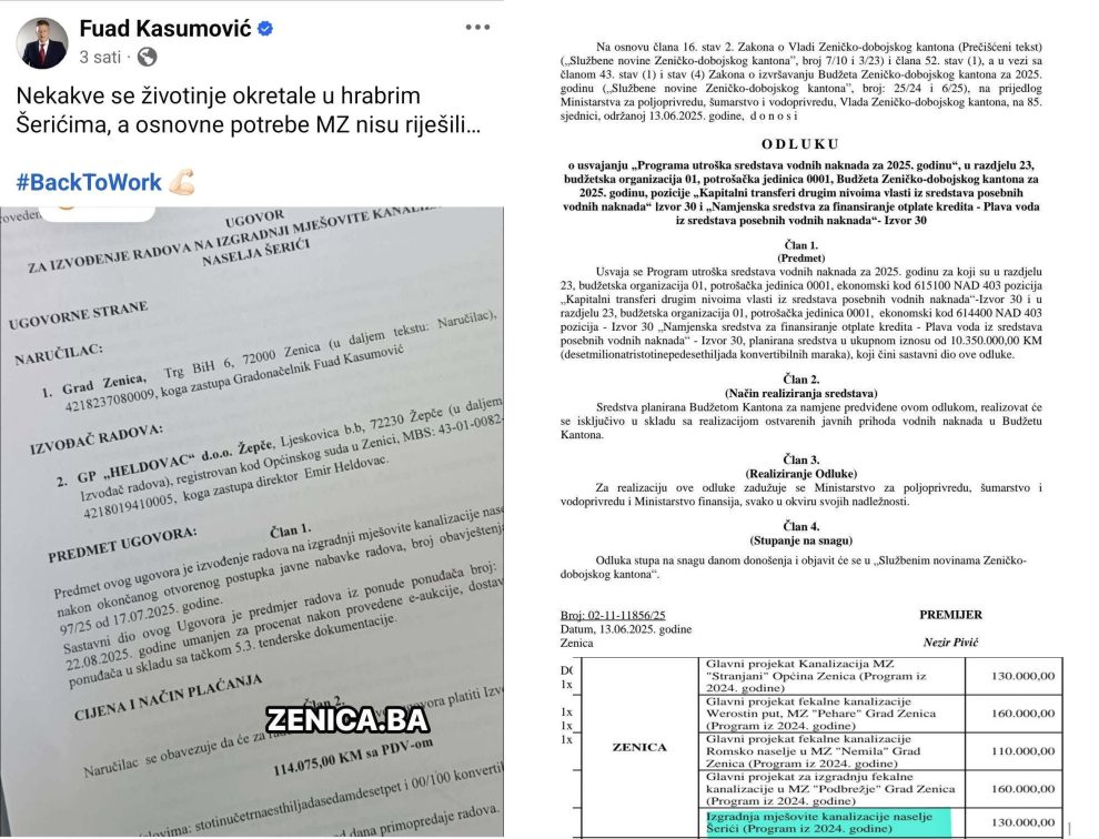 -Raduje me kada se ulažu sredstva u razvoj i stvaranje boljih uslova za život naših građana, ali me žalosti kada se na ovaj način, u nedostatku vizije i vlastitih sredstava, svojataju projekti koje finansira Vlada Zeničko-dobojskog kantona, kao što je projekt izgradnje kanalizacije u Šerićima. Ulažemo u našu Zenicu, kao i sve općine i gradove, vodeći računa o ravnomjernom razvoju cjelokupnog Zeničko-dobojskog kantona. Ne kiti se tuđim perjem, jer su u laži kratke noge! – naveo je uz objavu Kasumovićeve “odluke”, kao i odluke Vlade ZDK i tabele odobrenih sredstava premijer Pivić.