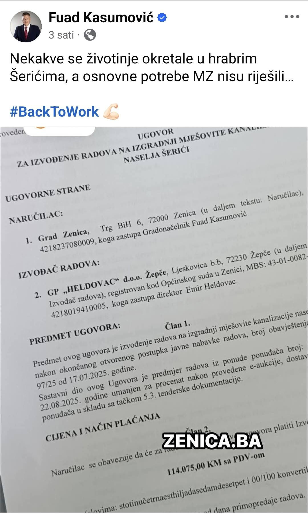 Na Facebook profilu Fuada Kasumovića, “friško” prvostepeno osuđenog gradonačelnika Zenice objavljena je danas, uz kratku poruku na engleskom “Povratak na posao” (Back to work) izjava sa prilogom u kojem se vidi odobravanje sredstava za izradu kanalizacije u jednoj zeničkoj mjesnoj zajednici –