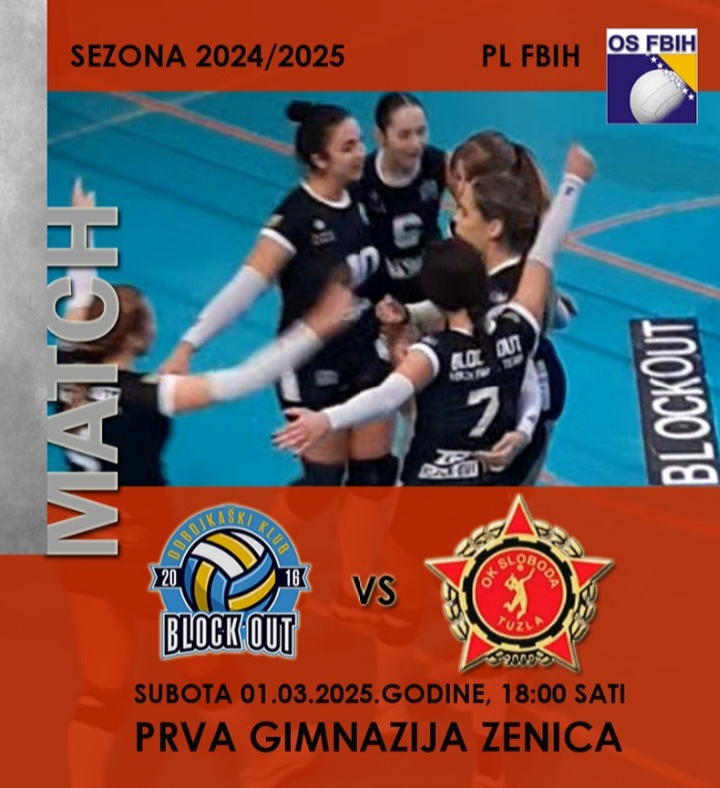 Utakmica OK “BLOCK OUT” vs OK “SLOBODA” Tuzla igra se ove subote, 01.03.2025. u Prvoj Gimnaziji Zenica sa početkom u 18:00 sati.
