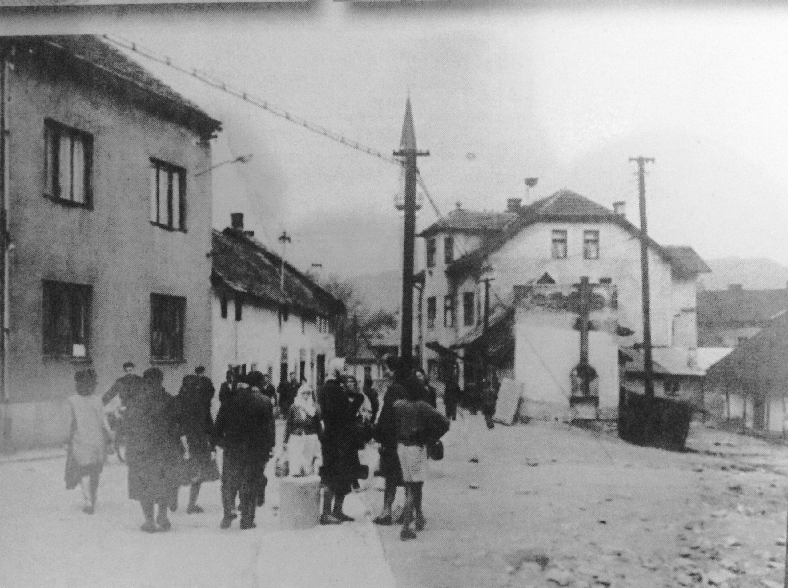 Uz Hadži Mazića kuću, muški i ženski frizeraj, sajdžija, presvlaka dugmadi (Žilet), Salčinović krojač, konfekcija Alija Hodžić, slastičarna. Nasuprot Tabaković sajdžija, pa Jusuf trgovac. Sa bočne strane magaza od trgovine, na stepenicama sjedi Vehbija koji čeka da Jusuf izda mušteriji brašno (vreća 50 kg), pa Vehbija to brašno odnese gdje mu mušterija kaže. Do Jusufove radnje druga radnja, prehrambena, po rasporedu unutrašnjem ista. Blagajnica Mina u ograđenom prostoru, mušterija na trgovačkom pultu rekne šta će pazariti, trgovac to napiše na paragon bloku u tri primjerka, mušterija sa dva primjerka bloka ide na blagajnu, plati, ovjeri mu se jedan primjerak, drugi ide na ekser koji je proboden kroz dasčicu, a mušterija sa ovjerenim blokom podiže robu koju je trgovac već pripremio.