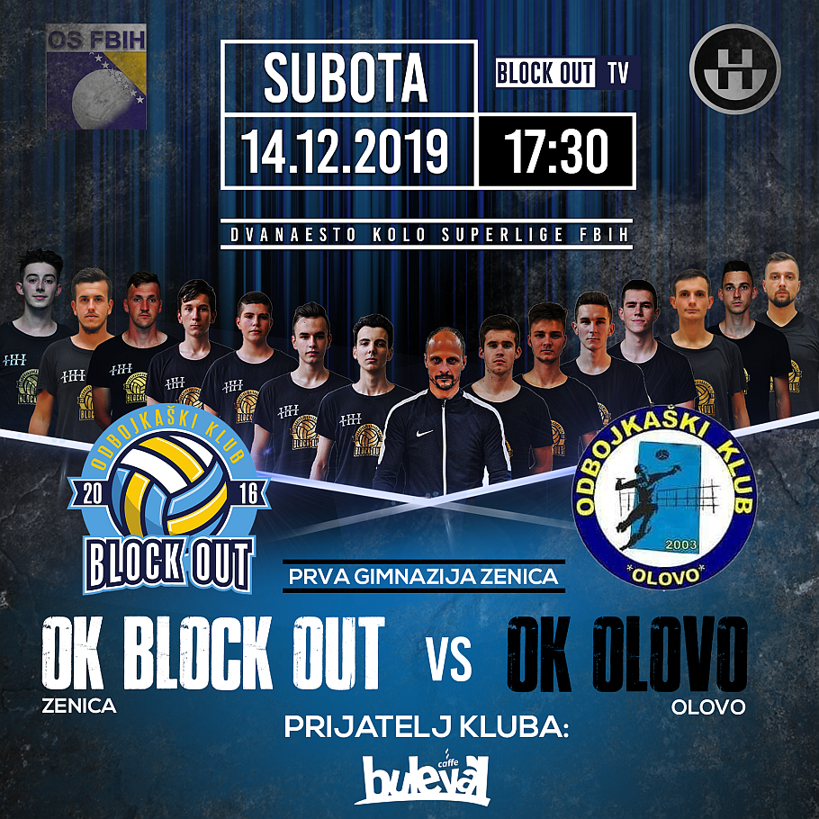 Utakmica OK “BLOCK OUT” Zenica – OK “OLOVO” Olovo igra se u subotu, 14.12.2019. u Prvoj Gimnaziji Zenica sa početkom u 17:30 sati.