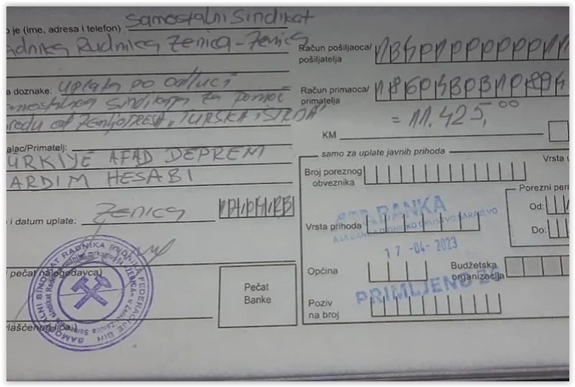 “Obavještavaju se komorati RMU ZENICA da je pomoć narodu Sirije i Turske uplaćena. Hvala svima koji su učestvovali i odazvali se ovoj humanitarnoj i plemenitoj akciji”, stoji u objavi koju potpisuje Samostalni sindikat RMU Zenica.