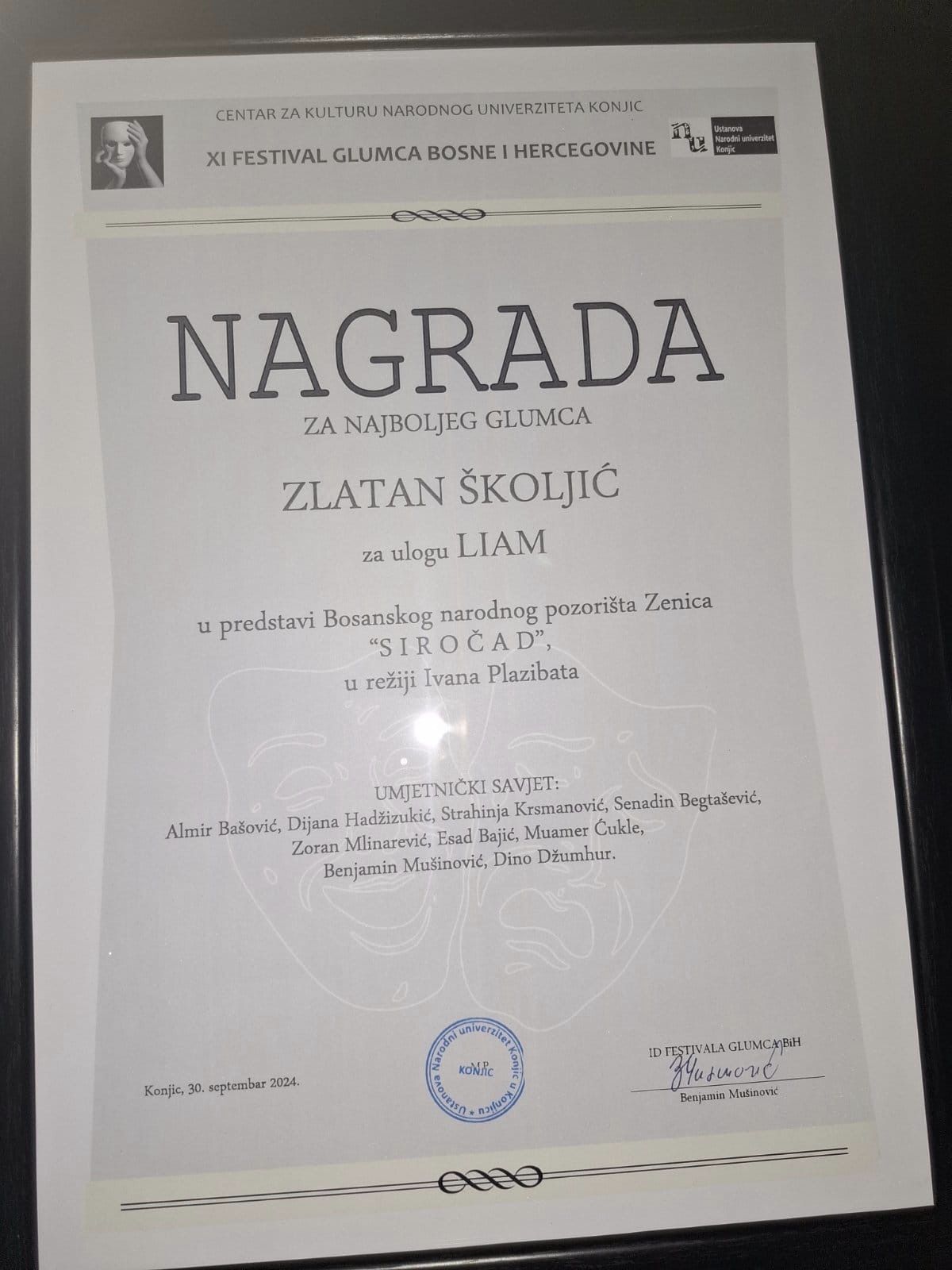 Glumac BNP Zenica Zlatan Školjić dobitnik je Nagrade za najboljeg glumca na 11. festivalu glumca BiH u Konjicu za ulogu Liama u predstavi “Siročad”, prema tekstu Denissa Kellyja, u režiji Ivana Plazibata i u produkciji Bosanskog narodnog pozorišta Zenica.