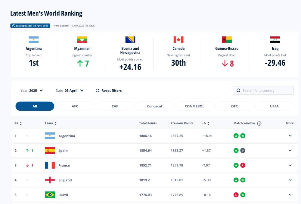 Argentina je ostala na prvoj poziciji, Španija je na drugom mjestu, Francuska je pala na treće mjesto, a Engleska i Brazil zadržali su četiri i petu poziciju.