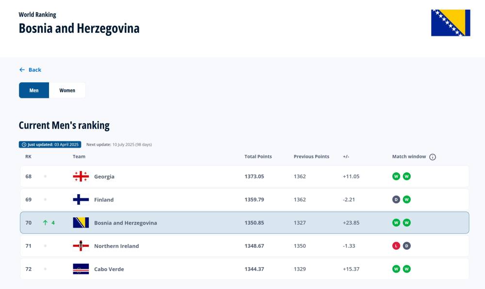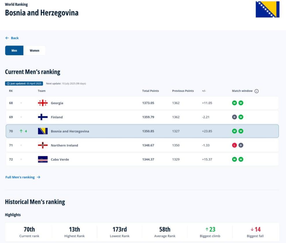 Na najnovijoj FIFA-inoj rang listi najboljih svjetskih reprezentacija, selekcija Bosne i Hercegovine napredovala je četiri pozicije i zauzima 70. mjesto sa 1.350 bodova.