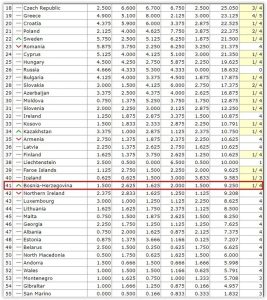 Zanimljivo da smo i uoči ove sezone bili na 41. mjestu, ali smo imali bolji koeficijent (9,75). Razlog tome je što smo u aktuelnoj sezoni zaradili samo 1,5 bod, a sezona koja se naredne godine neće računati (2018/19) 2,0 boda.